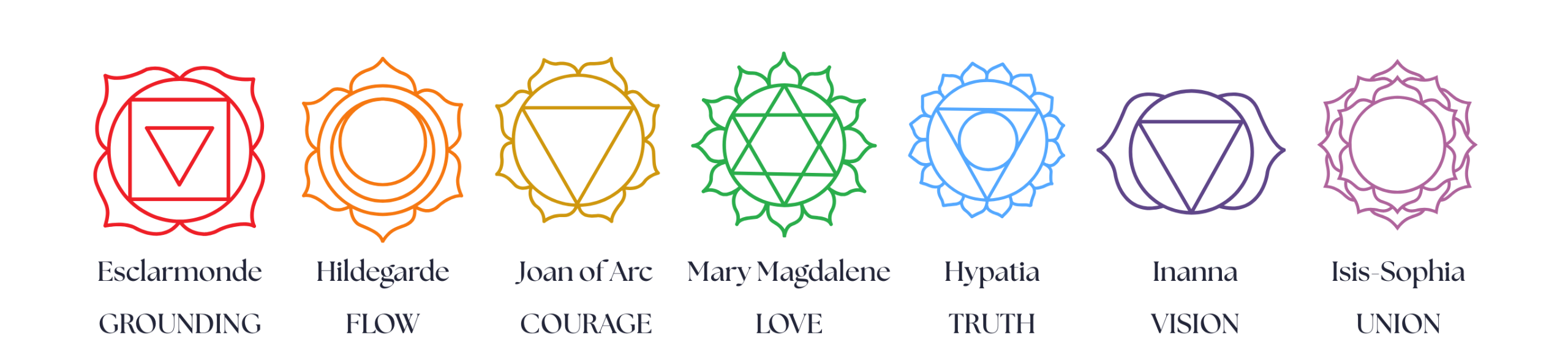 This journey unfolds through a living lineage of Sacred Feminine figures, each aligned with a chakra and sacred site. Together, these initiations form a continuous arc from embodiment to planetary stewardship.